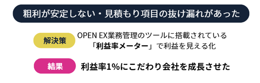 現在では、利益率30%を確保する社内基準を設け、着実に会社を成長させています。社長は、『見積もりシステムは、抜け漏れを防ぐ“保険”のような存在だ」と語っています。」