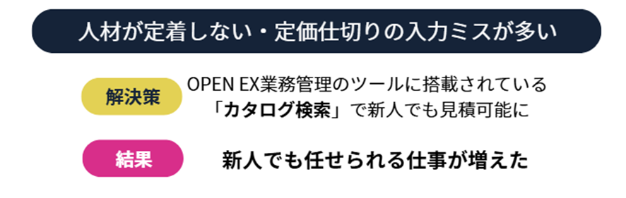 相談があった当時、ベテラン社員は教える時間がなく、教え方も分からなかったため、新人社員が社内で放置され、平均約3ヶ月で退職するという繰り返されていたそうです。特に見積業務は経験がないと難しいという考え方が根強くありましたが、いつまでもExcelで見積を作っていては何も変わらないとの思いから、思い切って新人でも使えるサービスを導入したとのことです。」