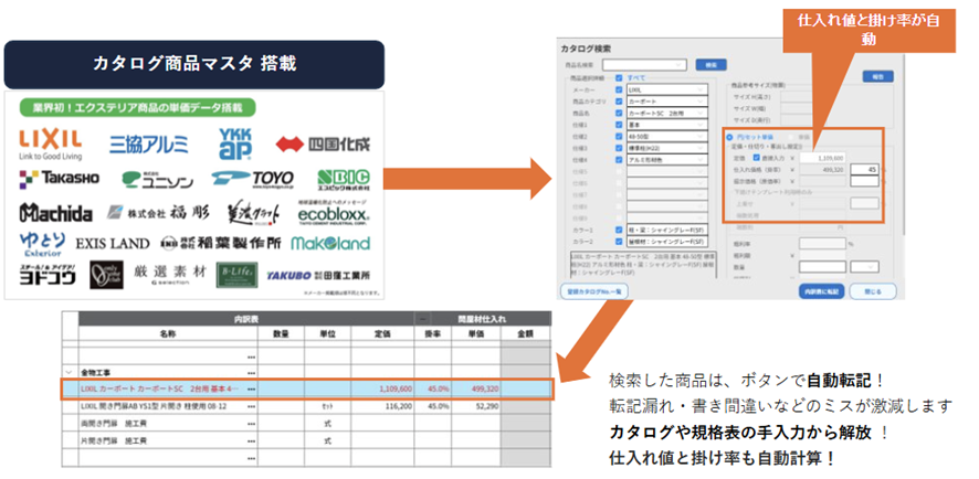 同じ文字の入力作業や、CAD図面からの拾い出しが複雑で手間がかかり、さらにカタログを開きながら見積書を作成するため、1件あたり1時間半から2時間を要することもありました。エクステリアの拾い出し作業が特に面倒とされる理由は、外構工事が多品種・少ロットで構成されているため、拾い出し方法がそれぞれ異なるからです。」